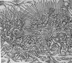 Traditional Swiss historiography since the 16th century has attributed the turning of the tide to the heroic deed of Arnold von Winkelried, who opened a breach in the Habsburg lines by throwing himself into their pikes, taking them down with his body so that the confederates could attack through the opening.[3] Winkelried is usually explained as a legendary figure introduced to explain the Swiss victory against the odds, perhaps as late as a full century after the battle. The earliest evidence of the Winkelried legend is the depiction of the battle in the Lucerne Chronicle of 1513. The oldest accounts of the battle are unambiguous in the judgement that the Swiss victory was against all odds and expectations, and is attributed to the grace of God.