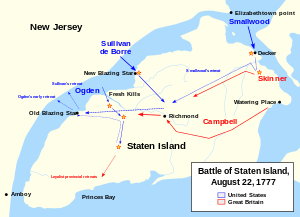 Sullivan, in the meantime, had learned that the departure of Howe's army had left Staten Island vulnerable, and planned and put into execution a raid against British targets there. He had learned that although the bulk of British regulars were near the northern end of the island, about 700 New Jersey Loyalist militia were scattered along the western shore, facing the New Jersey mainland.[9] His plan was to cross two groups onto the island from points in Elizabethtown (present-day Elizabeth, New Jersey), capture prisoners from the isolated militia outposts, and destroy supplies. They would then go to the Old Blazing Star Ferry (between present-day Carteret, New Jersey and Rossville, Staten Island) to return to the mainland.[10]