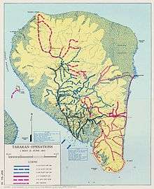 The Allied planners possessed detailed intelligence on Tarakan and its defenders. This intelligence had been gathered from a variety of sources which included signals intelligence, photographic reconnaissance flights and Dutch colonial officials.[16] Tarakan was the Australian Services Reconnaissance Department's (SRD) first priority from November 1944.[17] Prior to the invasion, I Corps requested that the SRD provide intelligence on Japanese positions in northern and central Tarakan. A five-man strong party landed on the island on the night of 25/26 April and successfully reconnoitered the defences on Tarakan's north coast, though the operative who was assigned to the centre of the island became lost and did not reach this area. The SRD operatives withdrew from Tarakan on the night of 29/30 April and landed on the mainland of Borneo. They were unable to transmit the intelligence they had collected, however, as their radio set malfunctioned. Members of the party eventually landed within the Allied beachhead on Tarakan on 3 May to report to the 26th Brigade, but Whitehead was disappointed with the results of this operation and made no further use of SRD during the battle.[18]