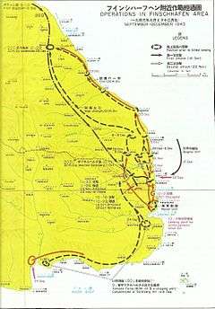The Japanese counter-attacks were eventually repulsed and after this, the Australians resumed their advance.[41] The plan called for a three-pronged attack by a divisional sized force of around 13,000 men.[42] While the 26th Infantry Brigade advanced to Wareo, the 24th Infantry Brigade took up a position on their right with the intention of capturing the area from Gusika on the coast to the "Lakes", two large water features about 2 miles (3.2 km) inland. The 20th Infantry Brigade advanced in the centre between the 24th and 26th Infantry Brigades, striking out for Wareo from Nongora.[10][34] Meanwhile, the 4th Infantry Brigade was assigned to defend the Allied beachhead around Finschhafen and Heldsbach, although it would later be employed in the coastal drive.[10][43]