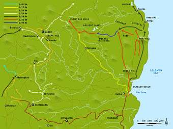 By 5 December, the Australians had managed to stockpile enough supplies in forward areas to enable the 2/24th Infantry Battalion, which had been engaged in moving the stores, to be released from this task and thrown back into the fighting.[48] In order to bypass the Japanese position, elements from the 2/23rd along with one company from the 2/24th carried out flanking manoeuvres to the west of the track were undertaken before the Australians established themselves in defensive positions short of Peak Hill.[48] On 6 December, the remaining three companies of the 2/24th came up and as the Australians continued to advance towards Peak Hill they found considerable Japanese positions which had been abandoned. As movement was seen in Wareo, which was visible in the distance, an artillery bombardment was called in by the Australians.[60] In the afternoon, the Australians cut the branch track that turned towards Kwatingkoo before an attack was put in on Peak Hill. The Japanese defences held and the attack beaten off, the Australians attempted to outflank to the north but they were prevented from doing so by the thick jungle and as the sun set, they had to be content to dig-in on the western approach to Peak Hill.[60]