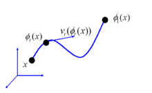 with the vector fields on termed the Eulerian velocity of the particles at position of the flow. The vector fields are functions in a function space, modelled as a smooth Hilbert space with the vector fields having 1-continuous derivative . For , with the inverse for the flow given by