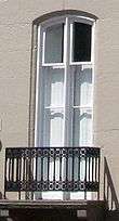 The Bayne-Fowle House is a three-story masonry town house in the Italianate design, located in a finely preserved block of the Old Town of Alexandria. It is surrounded by houses which date to the late 18th century. The house is made of brick with a painted ashlar sandstone facade, with elongated windows, a low-pitched gable roof, and an ornamental cornice. A side conservatory and small garden are found on the eastern side (the right hand side, as seen from the street).[3] Separating the double parlors is a pendant arcade adorned with cast-iron bosses.