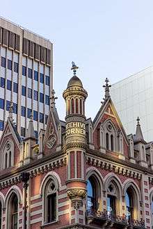 It had been a well-known landmark for fifty years in 1895 when what is essentially the present Beehive Buildings were built for the owner, Henry Martin to replace the antiquated structure. In the new design, four shops had frontages on King William Street and three facing Rundle Street, each 8 ft. (2.4 m) high, with jarrah floors and plastered walls and rear access and one shop 14 ft. (5.3 m) high, all having large plate-glass windows and nickel-plated columns. It was built three storeys above the pavement, and was Gothic in character, each gable finishing with crockets and a finial, and with open balustrades between them. At the main angle an ornamental turret was corbelled out, surmounted by a gilded beehive and bee and on the shaft of the turret the words 'Beehive Corner 1895' among foliage. The piers dividing the shopfronts were of Palmer granite. Sliding shutters were fitted to the windows facing King William Street, with a handsome iron verandah made by Fulton & Co. The sills of the windows facing Rundle Street were fitted with a small iron railing. The architects were English & Soward.[7]
