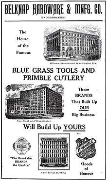 The company became one of the nation's largest wholesale enterprises with nationally known quality brands, among which Blue Grass was the most readily recognizable. John Primble knives, developed by an employee of the company, became a Belknap brand with its own division, made in Louisville between 1947 and 1985 by the John Primble Belknap Hardware Co.[9][10] The Crusader manufacturing brand of Belknap included contractors' shovels, hammers, hatchets, axes, drawing knives, carpenters' pincers, planes, screw drivers, hand drills, wrecking bars, bit braces, auger bits, chisels, pliers, wrenches, and tin snips.[11] Other popular Belknap manufactured products included rifles, guns, padlocks, lawn mowers, and bicycles. Belknap inventory in the vast warehouse spaces grew larger and larger, and the Belknap neon sign could be seen from miles away.[12]