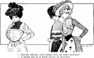 A 1900 cartoon from magazine Le Frou Frou (signed "Jan Duch") satirizing a style trend favoring small breasts (a large bosom may still be acceptable in the provinces, but not in Paris!). A "boyish figure" didn't actually become a mainstream fashion ideal until the 1920s.[2]