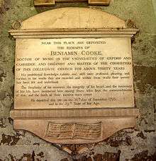 Cooke died on 14 September 1793, probably of a heart-attack, and was buried in Westminster Abbey.[5] He was succeeded at the Abbey by Samuel Arnold, while his son Robert Cooke (1768-1814) was appointed organist of St Martin's in the Fields. Robert Cooke eventually succeeded Arnold at the Abbey.[1]