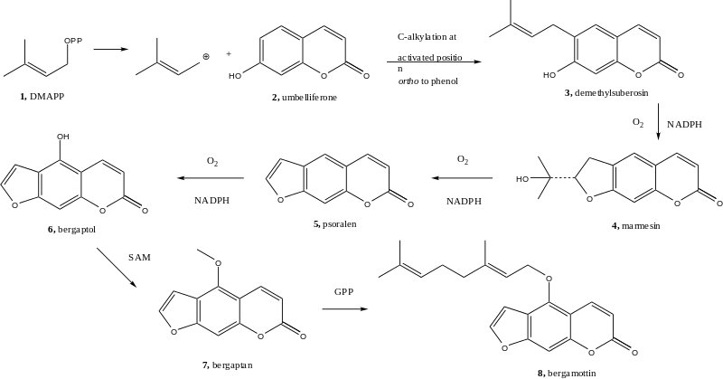 Bergamottin is derived from components originating in the shikimate pathway.[5] The biosynthesis of this compound starts with the formation of the demethylsuberosin (3) product, which is formed via the alkylation of the umbelliferone (2) compound.[6] The alkylation of the umbelliferone is initiated with the use of dimethylallyl pyrophosphate, more commonly known as DMAPP. The cyclization of an alkyl group occurs to form marmesin (4), which is done in the presence of NADPH and oxygen along with a cytochrome P450 monooxygenase catalyst.[7] This process is then repeated twice more, first to remove the hydroxyisopropyl substituent from marmesin (4) to form psoralen (5), and then to add a hydroxyl group to form bergaptol (6).[8] Bergaptol (6) is next methylated with S-adenosyl methionine (SAM) to form bergapten (7). The final step in this biosynthesis is the attachment of a GPP, or geranyl pyrophosphate, to the newly methylated bergapten (7) to form the target molecule bergamottin (8).