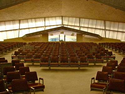The main sanctuary is large enough to hold about 1020 people. The second sanctuary, which holds roughly a hundred, is on the first floor of the synagogue. The main sanctuary was placed on the second floor to inspire a feeling that the people in the room are closer to heaven. Adding to the impression is the enormous tented fiberglass roof rising towards the heavens. "Tours are given by docents several days a week".[6]
