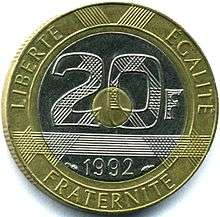 1992 French 20 Franc Tri-Metallic coin