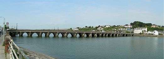 The original Long Bridge spanning the River Torridge connecting the East and West of the town was said to have been built out of timber in the year 1286. In 1474 the original structure was replaced by the masonry arch bridge seen today.[34] The bridge was built around the timber so people could still use it while construction was taking place, possibly resulting in the 24 arches all being of different sizes. A traditional explanation is that each arch was funded by a different local guild, although there are no records to confirm this. Another theory is that the piers of the arches of the bridge were built on naturally existing, and therefore randomly situated, large stones in the river. During the first decade of the 17th century, the bridge trustees were taken to court by the people of Bideford for feasting and seeing plays at the expense of the trust funds. The people won the court case, although it is unclear whether the trustees were forced to resign after the scandal, or whatever else happened to them. In 1790 the bridge was the longest in Devon.[35] In the 1820s there was talk of converting the bridge so that it could be raised and lowered to allow larger boats and ships to pass under it. In 1886 a Ship called 'Edward Birkbeck' launched from a Bideford shipyard hit the bridge, but only caused small damage by knocking some of the stones out. In 1925 another incident took place on the bridge: during the widening of the bridge a lorry came off the side of the bridge and crashed into the River Torridge, and it is believed that both the people in the lorry survived.[36] During World War Two the 10th arch of the bridge was being repaired, and the police asked for ladders and scaffolding to be removed from the bridge to prevent potential invaders climbing up and capturing the bridge. During the war the Home Guard patrolled the bridge.[37] The Bideford Bridge Trust held responsibility for the long bridge right up until the year 1968 when one of the arches of the bridge collapsed. The Department of Transport then took over the bridge. During the rebuilding of that damaged part of the bridge a crane toppled over, and a man was killed. An inspection by Devon County Council in July 2007 revealed problems with the bridge's concrete and structure, so in September 2008 work began on putting in the cathodic protection system which restored the bridge for another 60 years.[34] A sight which many holiday-makers and locals enjoy is seeing the starlings at dusk, as they roost underneath the bridge.