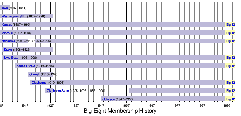 The conference was dissolved in 1996. Its membership at its dissolution consisted of the University of Nebraska, Iowa State University, the University of Colorado at Boulder, the University of Kansas, Kansas State University, the University of Missouri, the University of Oklahoma, and Oklahoma State University. The Big Eight kept its headquarters in Kansas City, Missouri.