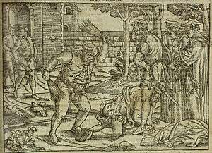 Edmund Bonner punishing a heretic in Foxe's Book of Martyrs (1563)