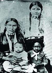 L to R: Mrs. Amos Chapman, her daughter, sister (all Southern Cheyenne, and an unidentified girl of African American descent. 1886[44]