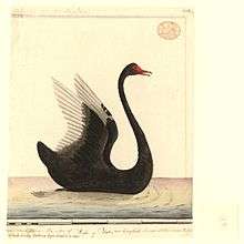 Governor Phillip, soon after establishing the convict settlement some sixty years later and 3,000 kilometres (1,900 mi) away at Botany Bay on the east coast, wrote in 1789 that "A black swan, which species, though proverbially rare in other parts of the world, is here by no means uncommon ... a very noble bird, larger than the common swan, and equally beautiful in form ... its wings were edged with white: the bill was tinged with red."[7] A contemporary, Surgeon-General John White, observed in 1790, "We found nine birds, that, whilst swimming, most perfectly resembled the rara avis of the ancients, a black swan."[7]