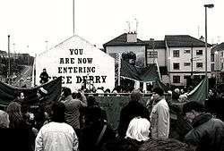 The City of Derry was perceived by many Catholics and Irish nationalists in Northern Ireland to be the epitome of what was described as "fifty years of Unionist misrule": despite having a nationalist majority, gerrymandering ensured elections to the City Corporation always returned a unionist majority. At the same time the city was perceived to be deprived of public investment – rail routes to the city were closed, motorways were not extended to it, a university was opened in the relatively small (Protestant-majority) town of Coleraine rather than Derry and, above all, the city's housing stock was in an appalling state.[14] The city therefore became a significant focus of the civil rights campaign led by organisations such as Northern Ireland Civil Rights Association (NICRA) in the late 1960s and it was in Derry that the so-called Battle of the Bogside – the event that more than any other pushed the Northern Ireland administration to ask for military support for civil policing – took place in August 1969.[15]