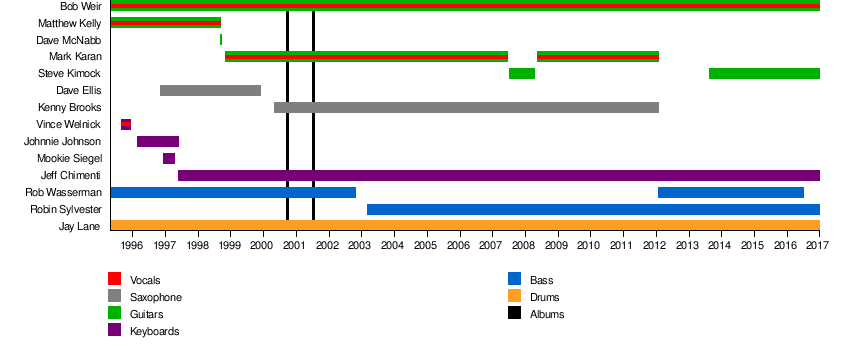 RatDog went through a series of personnel changes from 1995 and 2000. Former Grateful Dead keyboardist Vince Welnick performed with the group in late 1995. Former Chuck Berry collaborator Johnnie Johnson performed with the group from February 1996 to May 1997 and was then replaced by Jeff Chimenti who has been with the band ever since. Keyboardist Mookie Siegel also played with the band between 1996 and 1997. Saxophonist Dave Ellis was a member of the group from 1996 until 1999 when he was replaced by Kenny Brooks in 2000 until his departure in 2012. Mark Karan joined on guitar in 1998 until his departure in 2012. Original stand up bassist Rob Wasserman was replaced by bass guitarist Robin Sylvester in 2003. Wasserman rejoined the band in January 2012 and played alongside Sylvester until he died in June 2016. The lineup of Bob Weir (rhythm guitar, lead vocals), Jay Lane (drums, vocals), Jeff Chimenti (keyboards, vocals), Kenny Brooks (saxophone, vocals), Mark Karan (lead guitar, vocals) and Robin Sylvester (bass guitar, vocals) was the longest serving lineup of the band. They performed together for nine years from 2003 until 2012, with the exception of 2007 when Karan was replaced briefly by Steve Kimock to battle a health problem.