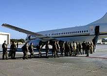 The C-40C is not equipped with the advanced communications capability of the C-40B. Unique to the C-40C is the capability to change its configuration to accommodate from 42 to 111 passengers.[5] The C-40C replaced three C-22s (a militarized Boeing 727) operated by the Air National Guard and National Guard Bureau to airlift personnel. By using commercial off-the-shelf acquisition practices and a new lease program for the C-40C model, the Air Force reached a benchmark for aircraft procurement.[5] The C-40C was the first military aircraft to be acquired in this manner. The 201st Airlift Squadron, District of Columbia Air National Guard acquired two C-40C aircraft in October 2002. The Air Force Reserve 932d Airlift Wing, Scott AFB, Illinois acquired three C-40C aircraft in 2007.[5]