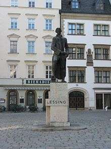 In the center of the southern end of the square is the monument to the German poet Gotthold Ephraim Lessing created by Siegfried Charoux (1896-1967). Charoux won the commission in 1930 in a competition with eighty two other sculptors. The monument was completed in 1931/32, unveiled in 1935, and soon removed in 1939 by the National Socialists to be melted down for the purpose of making weaponry. Lessing was in Vienna in 1775/76, had an audience with Joseph II.,[17] and was therefore in a position to influence and shape the Viennese cultural climate. Lessing's "Ringparabel" in the drama "Nathan der Weise" is considered a key text of the Enlightenment and helped in the formulation of the idea of tolerance. From 1962 to 65, Charoux created a second Lessing monument out of bronze, that was unveiled at Ruprechtskirche in 1968 and moved to Judenplatz in 1981.[18] This is the monument that stands on the square today.