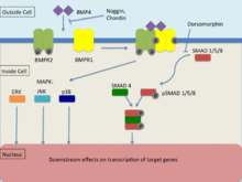 BMP4, as a member of the transforming growth factor-β (TGF-β) family binds to a 2 different types of serine-threonine kinase receptors known as BMPR1 and BMPR2.[21] Signal transduction via these receptors occurs via Smad and map kinase pathways to effect transcription of its target genes. In order for signal transduction to occur, both receptors must be functional. BMP is able to bind to BMPR2 without BMPR1 however, the affinity significantly increases in the presence of both receptors. BMPR1 is transphosphorylated via BMPR2 which induces downstream signalling within the cell, affecting transcription.[21]