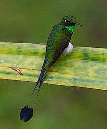 The booted racket-tail (Ocreatus underwoodii) is a species of hummingbird. It is found in the Andean cordillera of Bolivia, Colombia, Ecuador, Peru, and Venezuela. A population also occurs on the Venezuelan coast. This is the only species in the monotypic genus Ocreatus.[2]
