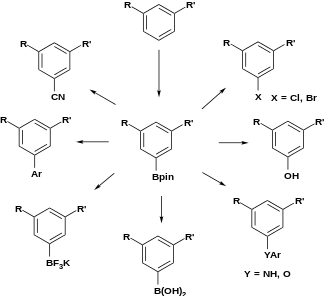 The synthetic importance of aromatic C–H borylation is shown below, where a 1,3-disubstited aromatic compound can be directly converted to a 1,3,5-organoborane compound and subsequently functionalized.[15]