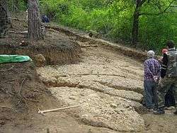 According to Osmanagić, the excavation has produced evidence of entrance plateau and building blocks that could be part of a pyramid's outer surface, as well as tunnels.[9][11] Additionally, Osmanagić states that he has found tunnels in the hillside.[11] Osmanagić claims that the conglomerate blocks were made of concrete which was poured on site, initially supported by Joseph Davidovits.[4][11] The tunnels, named as Ravne tunnels, are claimed to be ancient man-made underground network connecting the three pyramids.[9][12] They are thought to be 2.4 miles (3.8km) long.[9] Osmanagić claims the tunnels were partially filled when sea levels rose by 1,500 feet at the end of the Ice Age, and that there various in-tunnels boulders from 15,000 years ago.[4][11] It is claimed that within them were found fossilised leaves which are dated 34,000 years ago.[12]