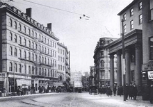 Bowdoin Square (established 1788) in Boston, Massachusetts was located in the West End. In the 18th and 19th centuries it featured residential houses, leafy trees, a church, hotel, theatre and other buildings. Among the notables who have lived in the square: physician Thomas Bulfinch; merchant Kirk Boott;[1][2] and mayor Theodore Lyman.[3] Since the 20th century the area has become a traffic intersection at Cambridge Street, Bowdoin Street, and New Chardon Street.[4][5] Bowdoin Square is served by the MBTA Blue Line station Bowdoin.