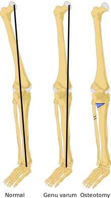 Genu varum (also called bow-leggedness, bandiness, bandy-leg, and tibia vara), is a physical deformity marked by (outward) bowing of the lower leg in relation to the thigh, giving the appearance of an archer's bow. Usually medial angulation of both femur and tibia is involved.