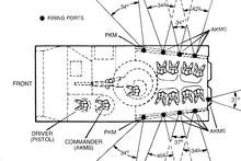 The requirement for the BMP, which was first drawn up in the late 1950s, stressed speed, good armament, and the ability for all squad members to fire from within the vehicle. The armament had to provide direct support for dismounted infantry in the attack and defense and to be able to destroy comparable light armored vehicles.[16] The vehicle needed to protect the crew from .50 cal machinegun fire and 20–23 mm caliber autocannons across the frontal arc, as well as from light shell fragments at distances between 500 m and 800 m.[17]