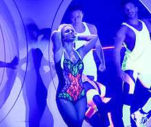 On The Onyx Hotel Tour in 2004, it featured male dancers pushing her while she was standing in luggage carts.[28] During her performance of the song on The Circus Starring Britney Spears, the singer performed wearing a military costume, while surrounded by her dancers, some of them riding bicycles.[29] The rendition was described as a "Rhythm Nation-like military stomp."[30] On 2011's Femme Fatale Tour, Spears wears a golden cape for a snake charming number of the song.[31] Spears included "Boys" on the setlist of her 2013-15 Las Vegas residency, Britney: Piece of Me. During this performance, she and her dancers wear neon outfits. Sophie Schillaci from MTV considered the performance "crowd-pleasing".[32]