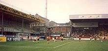 On 17 March 1932, Bradford City paid Midland Railway Company £3,750 for the remaining two-thirds of the site to become outright owners of the ground, which was now 45 years old.[19] The stadium had remained virtually unchanged since 1908, and did so until 1952,[8][16] when the capacity of the ground was reduced after examinations of the foundations were ordered following the 1946 Burnden Park disaster. The investigation resulted in the closure of half the Midland Road stand. The stand's steel frame was then sold to Berwick Rangers for £450 and a smaller replacement stand was built at Valley Parade in 1954.[19] Six years later, the stand had to be demolished for a second time because of continuing foundation problems.[20] It was another six years before all four stands at Valley Parade were able to be opened for the first time. To enable construction of a new stand on the Midland Road side of the ground, the club directors moved the pitch 3 yards (2.7 m) closer to the main stand. The new stand was then the narrowest stand in the league.[20] Further improvements were made to the stand in 1969, ready for the club's FA Cup tie with Division One side Tottenham Hotspur on 3 January 1970,[20] which ended in a 2–2 draw in front of 23,000 fans.[21] The cost of the work forced the club to sell Valley Parade to Bradford Corporation for £35,000, but it was bought back by 1979 for the same price.[22]