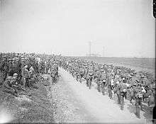 Men of the 1st Battalion, Royal Scots Fusiliers watching the 7th (Service) Battalion, King's Shropshire Light Infantry marching up to the outpost line, 3rd Division, 11 April 1918.