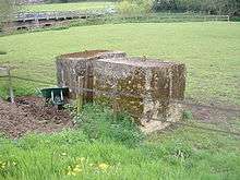 The simplest of the removable roadblocks consisted of concrete cylinders of various sizes but typically about 3 feet (0.91 m) high and 2 feet (61 cm) in diameter; these could be manhandled into position as required.[56] However, these would be insufficient to stop armoured vehicles. One common type of removable anti-tank roadblock comprised a pair of massive concrete buttresses permanently installed at the roadside; these buttresses had holes and/or slots to accept horizontal railway lines or rolled steel joists (RSJs). Similar blocks were placed across railway tracks[57] because tanks can move along tracks almost as easily as they can along roads. These blocks would be placed strategically where it was difficult for a vehicle to go around—anti-tank obstacles and mines being positioned as required—and they could be opened or closed within a matter of minutes.[58]