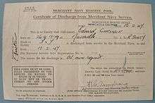 The pay of merchant seamen was poor when compared to the pay received by a factory worker or building site worker ashore.[45] A primary factor was the long working hours of the merchant seaman who had a basic working week of 64 hours before overtime compared with the working week of 44 hours in the building industry then or 47 hours in the engineering industry. In 1943 the seaman's basic working week was reduced to 56 hours.[46] Considerable resentment was felt by seamen after learning that seamen of the U.S. Merchant Marine earned more than double their wages.