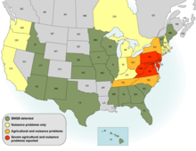 As of 2010, seventeen states have been categorized as having established BMSB populations, with several other states along the eastern half of the United States were reported as having more than normal numbers of stink bugs.[24][25] Currently stink bug populations are on the rise because the climate in the United States is ideal for their reproduction. In optimal conditions an adult stink bug will develop within 35 to 45 days after hatching.[16] Female stink bugs are capable of laying four hundred eggs in their lifetime.[26] BMSB is also capable of producing at least one successful generation per year in all areas of the United States, no matter the climate. In warmer climates, multiple generations can occur annually, which can range from two generations in states such as Virginia to six generations in states such as California, Arizona, Florida, Louisiana, and Texas.[16][27][28]
