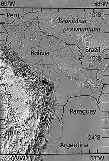 Brunfelsia plowmaniana[1] is a species of flowering plant of the nightshade family that is native to the cloud forests of the Bolivian and Argentinian Andes. It was first described in 2012 on the basis of systematic DNA barcoding of specimens from the genus Brunfelsia. Specimens belonging to the new species had previously been placed in the polymorphic species B. uniflora, which a molecular phylogeny revealed as polyphyletic.
