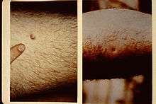 Physical proof of alien abduction for Hopkins, came in the form of scoop marks,[37][38] or indentations of the skin, scars or cuts[37] on the mouth, nose, ears or genital,[2] or unexplained bruises[37] that might clear up in a day,[64] and abductee claims of implants[2][4] interpreted as control or monitoring devices similar to those used by (human) scientists to track and tag animals in the wild.[10][15][56] He also believed the alien spacecraft left marks on the ground where they landed and that the aliens could be photographed.[38]