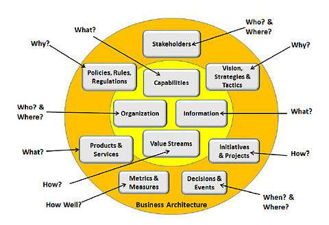 The Zachman Framework is a popular enterprise architecture framework used by business architects. The framework provides ontology of fundamental enterprise concepts that are defined from the intersection of six interrogative categories: What, How, Where, Who, When, Why, and six perspectives: Executive, Business Management, Architect, Engineer, Technician, and Enterprise. Typically, business architects are interested in the concepts associated with the top two perspectives: Executive and Business Management. The Executive perspective is concerned with the scope and context of the business. The Business Management perspective is concerned with business definition models.[13]