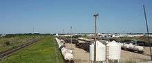The Grand Trunk Bridge (Saskatoon) or CN Bridge crosses the South Saskatchewan River between the Queen Elizabeth Power Station on the upstream (west) side and Diefenbaker Park on the downstream (east) side. The train bridge commenced construction work in 1906 with rail line service beginning on September 21, 1908.[1] A southwest extension of Circle Drive, which opened in July 2013, passes through C.N. Industrial.[2] Access to businesses in C.N. Industrial is facilitated via an interchange at Lorne Avenue, but the area is now split into two sections with Jasper Avenue no longer crossing Circle Drive.