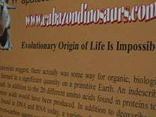 The Cabazon Dinosaurs attraction also features an open-air museum with fiberglass and robotic dinosaurs. Other activities at the site include a sand pit where visitors can experience a "dino dig"[10] as well as a gemstone and fossil-panning sluice. Pastor Robert Chiles, assisting Kanter in turning the exhibit into a non-denominational church, has been quoted as to his belief of why children are drawn to the dinosaur attraction, "There's something in their DNA that knows man walked with these creatures on Earth."[9] Chiles and Kanter plan to promote their views of creationism at the attraction based on their interpretation of the Book of Genesis.[9]