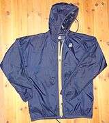 A cagoule, cagoul, kagoule or kagool (from the French cagoule meaning balaklava) is the British English term for a lightweight (usually without lining), weatherproof raincoat or anorak with a hood, which often comes in knee-length.[1] The American English equivalent is windbreaker; the Canadian English equivalent is windbreaker or K-Way; the Australian English equivalent is parka .