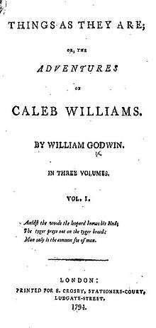 Things as They Are; or The Adventures of Caleb Williams (often abbreviated to Caleb Williams) (1794) by William Godwin is a three-volume novel written as a call to end the abuse of power by what Godwin saw as a tyrannical government. Intended as a popularisation of the ideas presented in his 1793 treatise Political Justice Godwin uses Caleb Williams to show how legal and other institutions can and do destroy individuals, even when the people the justice system touches are innocent of any crime. This reality, in Godwin's mind, was therefore a description of "things as they are." The original manuscript included a preface that was removed from publication, because its content alarmed booksellers of the time.[1]