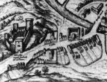 Under Henry II the castle was adequately maintained, but little additional work was undertaken to improve it.[9] A castle-guard system was established, under which lands around Cambridge were granted to local lords on the condition that they provide guard forces for the castle, and the castle was primarily used to hold the sheriff's court and records.[10] King John expanded the castle in the years before the First Barons' War of 1215 to 1217, but this work was concentrated on constructing a new hall and chamber, at the cost of £200.[11][nb 2] During the war, the rebel barons, supported by Prince Louis of France, captured much of eastern England; Cambridge Castle fell in 1216.[13] The castle was returned to royal control after the war, but Henry III only conducted basic maintenance of the fortification.[14] Cambridge was attacked again during the Second Barons' War in 1266.[15] This time the town and castle held long enough to be relieved by Henry's forces, but the king reinforced the city defences with a large ditch, later known as King's Ditch.[15]