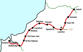 The North Cornwall Railway was a railway line running from Halwill in Devon to Padstow in Cornwall via Launceston, Camelford and Wadebridge, a distance of 49 miles 67 chains (80.21 km). Opened in the last decade of the nineteenth century, it was part of a drive by the London and South Western Railway (LSWR) to develop holiday traffic to Cornwall. The LSWR had opened a line connecting Exeter with Holsworthy in 1879,[1] and by encouraging the North Cornwall Railway it planned to create railway access to previously inaccessible parts of the northern coastal area.