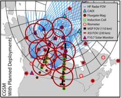 Anticipated CGSM stakeholders met in Edmonton in June 2002 to initiate planning for the program. An ambitious plan was settled on, requiring numerous new instruments of various types to be deployed in challenging remote environments. The instruments would need to operate autonomously for long periods, and suffer few breakdowns. Much of the data would need to be recovered in real-time in order for CGSM to develop into an important space weather program, in addition to its space science objectives. New instruments would need to be acquired, outfitted and fielded at existing and new sites. To accomplish this, the team settled on using Telesat Canada's HSi High Speed Satellite Internet system, in conjunction with an information technology infrastructure (basically a glorified local area network with additional capabilities including UPS, GPS, and attached hard-disk storage). Further, members of the team applied to the Canada Foundation for Innovation for fubds for new instruments, and were successful on all fronts. The resulting funding enabled the deployment (which is still ongoing) of an additional 8 All-Sky Imagers, 14 fluxgate magnetometers, 8 induction coil magnetometers, and two additional SuperDARN radars (the new "PolarDARN" radars). In addition to facilities that were already in place in 2002 (from the Canadian Space Agency's CANOPUS[3] program, the Natural Resources Canada CANMOS magnetometer array, and the NSERC supported NORSTAR, SuperDARN, and CADI programs), the final array will certainly meet the scientific requirements.