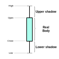 Candlesticks are usually composed of the body (black or white), and an upper and a lower shadow (wick): the area between the open and the close is called the real body, price excursions above and below the real body are called shadows. The wick illustrates the highest and lowest traded prices of a security during the time interval represented. The body illustrates the opening and closing trades. If the security closed higher than it opened, the body is white or unfilled, with the opening price at the bottom of the body and the closing price at the top. If the security closed lower than it opened, the body is black, with the opening price at the top and the closing price at the bottom. A candlestick need not have either a body or a wick.[6]