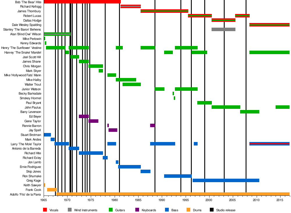Since the early 1970s, numerous personnel changes have occurred, although the current lineup includes all three surviving members of the classic lineup: de la Parra (who has remained in the band since first joining in 1967), Mandel, and Taylor. For much of the 1990s and 2000s, de la Parra was the only member from the band's 1960s lineup. He wrote a book about the band's career.[1] Larry Taylor, whose presence in the band has not been steady, is the other surviving member from the earliest lineups. Mandel, Walter Trout and Junior Watson are among the guitarists who gained fame for playing in later editions of the band. British blues pioneer John Mayall found several musicians for his band among former members of Canned Heat.