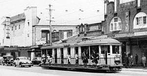 In 1921, a tram line was extended from Hurlstone Park to Canterbury Station, in 1927, a through service from Canterbury to the city commenced. The Canterbury line commenced at the Canterbury terminus in Broughton Street where a tram turning loop was provided.[4] Trams travelling towards the City or Balmain headed north-east along Canterbury Road. A service that was provided for by the Darling Street Wharf trams branched off from the main line at New Canterbury Road and connected with lines running along Parramatta Road for Balmain. Services heading towards Marrickville, Newtown, Sydenham and Tempe turned right into Marrickville Road.[5]