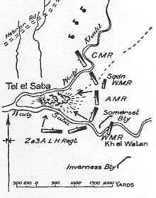 The regiment started advancing towards the village, the 8th Squadron on the left, and the 10th with the 1st Squadron on the right. Covered by their machine-guns, but under heavy Turkish fire, they gradually moved forward on foot. Troops took turns to run forward while the rest of the squadron covered them.[72] The intensity of the battle was demonstrated by the Inverness Battery Royal Horse Artillery, which was supporting the brigade and ran out of ammunition at 14:00. Two hours later the division's covering force reported Turkish reinforcements approaching, and Lieutenant-General Philip Chetwode, who was commanding the attack, decided to call it off. Almost simultaneously Edward Chaytor, commanding the brigade, ordered another attack. Covered by their machine-guns the men carried out a bayonet charge and the Turks to their front surrendered. By this time the other brigades had started to withdraw, but seeing what had happened, they turned back and also charge, capturing the position.[72] The battle cost the regiment six dead and nineteen wounded.[73]